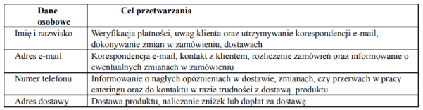 - Kiedy składasz zamówienie na catering dietetyczny — kiedy składasz zamówienie na catering dietetycznych gromadzone są konkretne dane osobowe pozwalające na realizację zamówienia takie jak: imię, nazwisko, adres e-mail, adres zamieszkania, kod pocztowy, numer telefonu, numer konta bankowego,