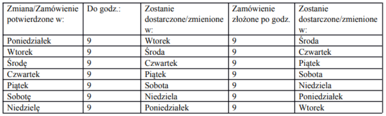 4. Godziny w Tabeli 1 są również wiążące w stosunku do dokonywania zmian w zamówieniu takich jak zmiana Produktu lub adresu dostawy.